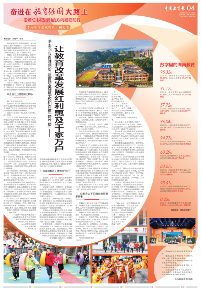三湘大地上,走进普惠幼儿园的孩子越来越多,边远地区义务教育和普通高中的优质学位大幅增加,一批改扩建的楚怡公办中职学校迎来发展新机遇……湖南这一系列扩优提质民生项目的实施,正让教育改革发展的红利惠及千家万户。