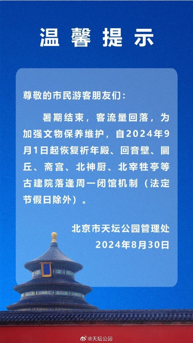 暑期进入尾声,新学期将至。北京多家博物馆近日发布消息称,将结束暑期延时开放,恢复每周一闭馆机制。此外,多家公园部分建筑也恢复周一闭馆机制。
