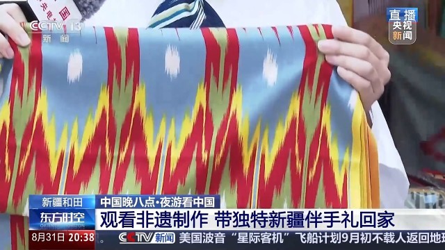 第一种就是艾德莱丝绸,是用蚕丝和天然植物染料制作而成。它的宽只有40多厘米,但制作衣服时,要将这些花纹完整拼接在一起,非常考验手艺。