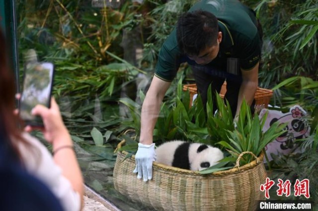 广州长隆野生动物世界13日官宣全球唯一大熊猫三胞胎大姐“萌萌”的女儿昵称为“妹猪”。图为摇篮中的“妹猪”软萌可爱。(陈骥旻 摄)