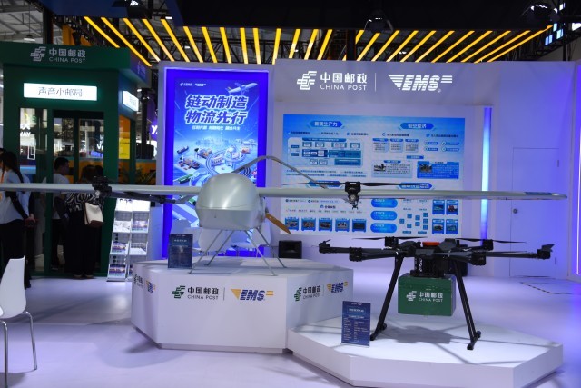 中国邮政速递物流(EMS)展出的T100中型(左)无人机和M10型号(右)无人机。实习生 张轩/摄
