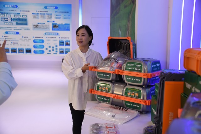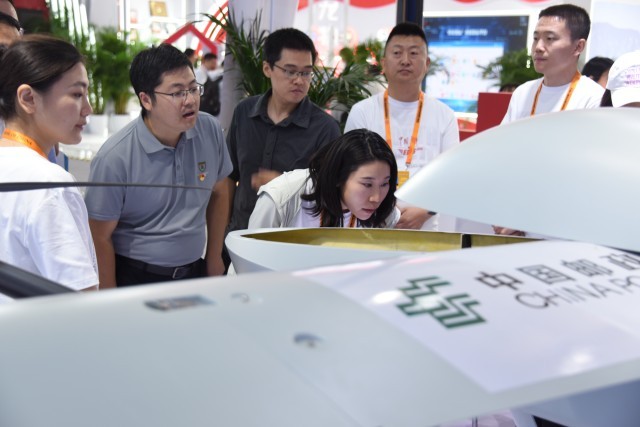 在中国邮政速递物流展区(EMS),现场嘉宾仔细观察T100无人机并了解有关细节。实习生 张轩/摄