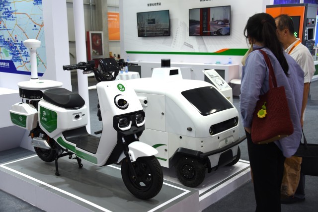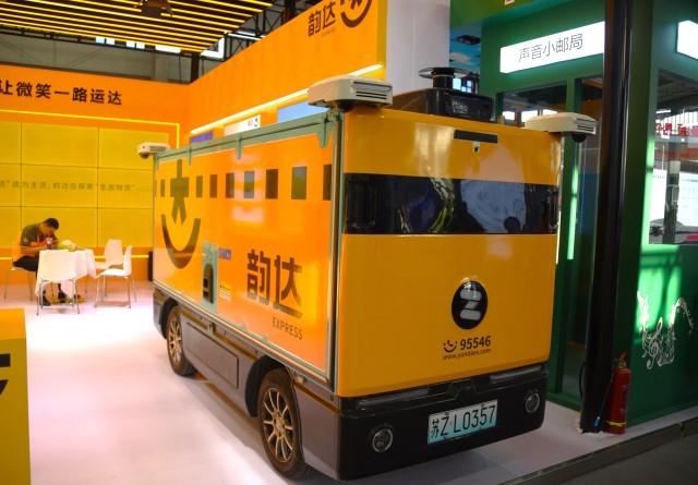 韵达展区的纯电动无人快递车具有5立方米存储空间、800公斤的载重和单次充电180公里的续航里程,在快充技术的加持下两个小时即可完成充电。实习生 张轩/摄