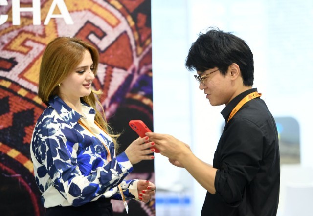 9月15日,在服贸会国家会议中心展区,阿塞拜疆展台的参展商(左)与一名中方工作人员交流。新华社记者 逯阳 摄