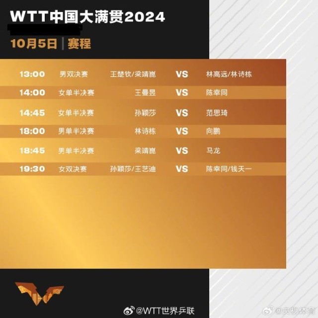 10月5日,WTT中国大满贯赛开启正赛第七日的争夺。由王楚钦和孙颖莎参加的男双、女双决赛将上演精彩对决。孙颖莎、王曼昱将参加女单半决赛。马龙、林诗栋将参加男单半决赛。六场比赛全部都是中国队内赛。