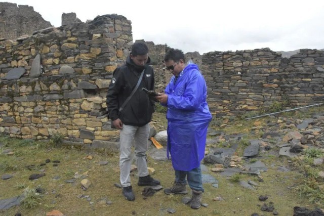 普查队员正在采集和复核日喀则市桑珠孜区塔巴遗址本体边界坐标及单体范围。新华社记者 春拉 摄