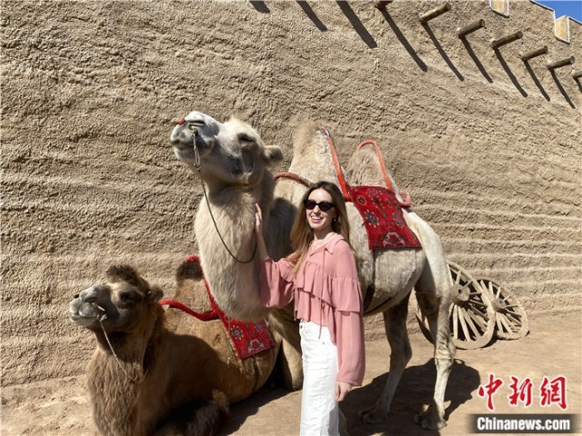 丽娜在景区和骆驼合影留念。苏亦瑜 摄