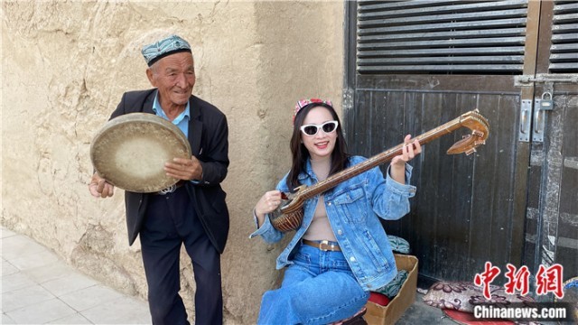 爱玲在景区体验新疆传统乐器热瓦普。苏亦瑜 摄