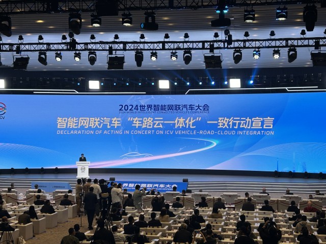 在10月17日举行的“2024世界智能网联汽车大会”全体大会上,智能网联汽车“车路云一体化”一致行动宣言正式发布。中青报·中青网记者 贾骥业/摄
