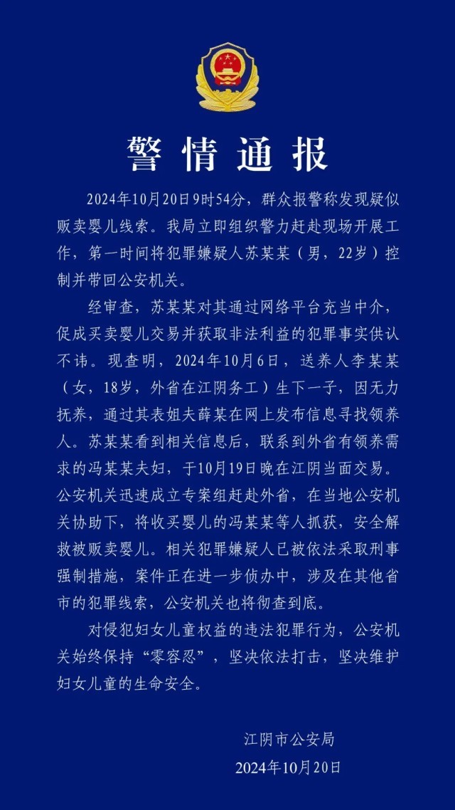 现查明,2024年10月6日,送养人李某某(女,18岁,外省在江阴务工)生下一子,因无力抚养,通过其表姐夫薛某在网上发布信息寻找领养人。苏某某看到相关信息后,联系到外省有领养需求的冯某某夫妇,于10月19日晚在江阴当面交易。公安机关迅速成立专案组赶赴外省,在当地公安机关协助下,将收买婴儿的冯某某等人抓获,安全解救被贩卖婴儿。相关犯罪嫌疑人已被依法采取刑事强制措施,案件正在进一步侦办中,涉及在其他省市的犯罪线索,公安机关也将彻查到底。