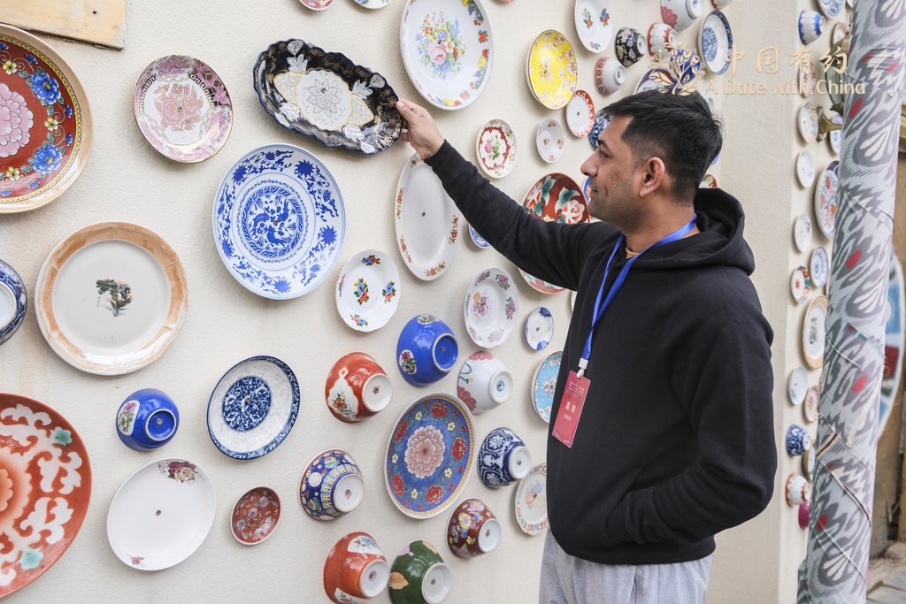 巴基斯坦自媒体人哈桑正在观赏龟兹小巷墙上的装饰品