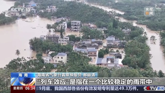 海南省气象台首席预报员 郝丽清:“列车效应”是指在一个比较稳定的雨带中,看上去整体的位置不怎么动,但是雨带里又有些单体沿着雨带不停往前走。就像一个列车看似是不动了,但是它在一个地点上不断有云体从上面经过的。就海南岛东部来说,它承受了很多的雨水,所以造成连续两天种特大暴雨。