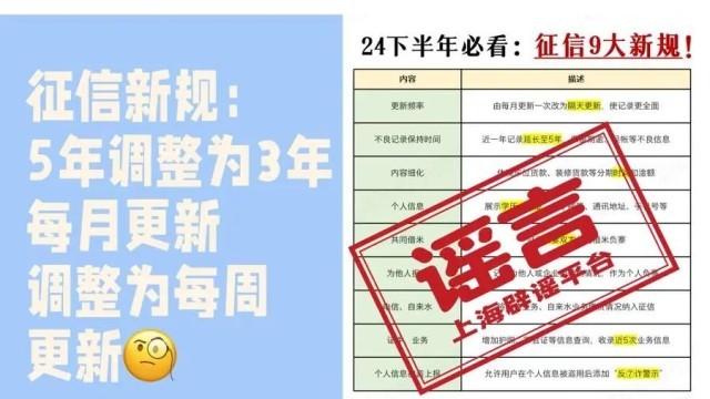 “征信新规:5年调整为3年,每月更新调整为每周更新”“征信9大新规,每月更新一次改为隔天更新”……最近,社交平台上出现不少有关“征信新规”的帖子,称相关部门对个人不良信用信息的内容、保留期限等进行了调整。但央行征信中心通过官方微信号声明,网传消息不实,目前并未有新规定发布。根据《征信业管理条例》第十六条规定,个人不良信息的保存期限,自不良行为或者事件终止之日起为5年;超过5年的,将不予展示。