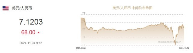 中新网11月4日电 据中国外汇交易中心网站消息,中国人民银行授权中国外汇交易中心公布,2024年11月4日银行间外汇市场人民币汇率中间价为:1美元对人民币7.1203元,下调68个基点。