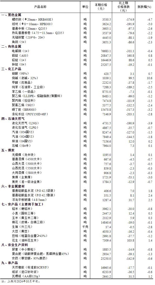 2024年10月下旬流通领域重要生产资料市场价格变动情况