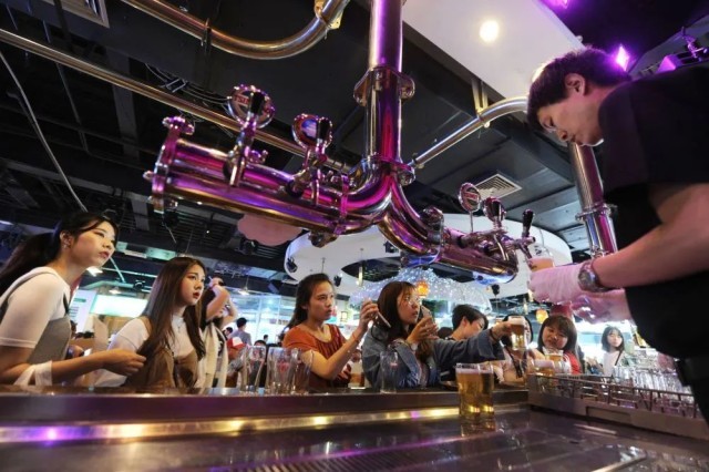食客在青岛啤酒街排队购买啤酒。新华社发(王海滨 摄)