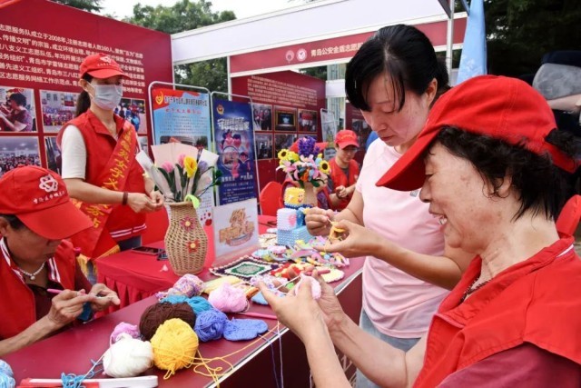 在青岛市城阳区志愿服务广场,志愿者在展示交流活动中学习、交流。新华社记者 李紫恒 摄