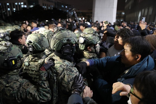 当地时间2月4日凌晨,韩国首尔,韩国国会大楼前出现冲突,韩国军人进入国会现场维持秩序时遭民众阻拦。视觉中国供图