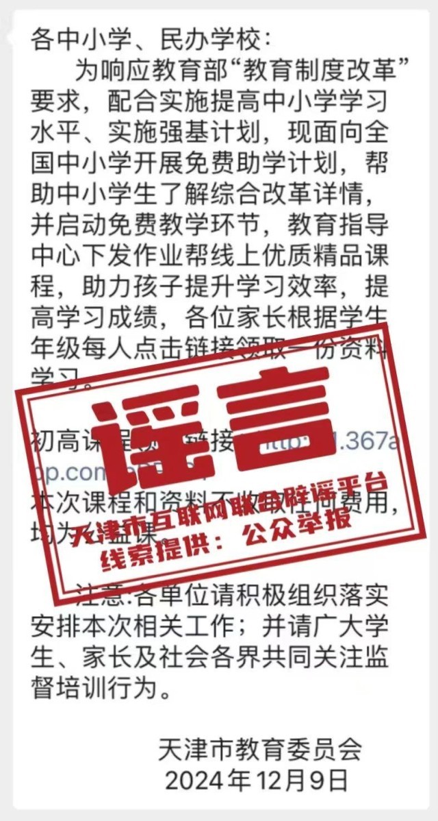 12月9日,网上传播署名“天津市教育委员会”的一则信息,信息中提及“开展免费助学计划”“启动免费教学环节”“下发线上优质精品课程”“各位家长根据学生年级点击链接领取资料”等相关信息。