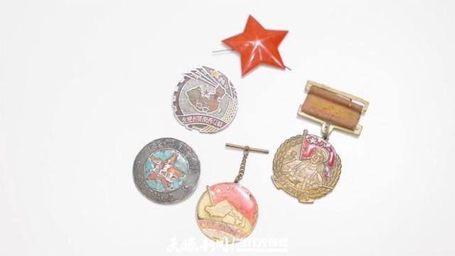 梁光财帽子上取下的五角星和获得的纪念徽章