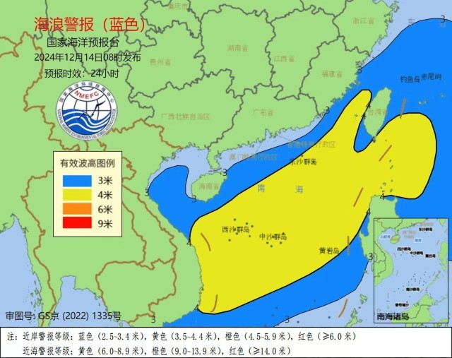 预计12月14日中午到15日中午,台湾海峡,南海北部、中部将出现3.5到5米的大浪到巨浪区;福建,海南东部、南部近岸海域将出现2到3.4米的中浪到大浪,近岸海域海浪预警级别为蓝色。国家海洋预报台提醒在上述海域作业的船只注意安全,沿海各有关单位提前采取防浪避浪措施。