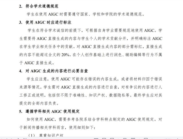 比如,华东师范大学在今年8月,联合北京师范大学新闻传播学院发布《生成式人工智能学生使用指南》,指南中最引人关注的一条规则是,使用生成式人工智能(AIGC)时应明确标注,且直接生成内容不超过全文的20%。