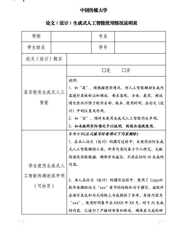 《中国传媒大学论文(设计)生成式人工智能使用情况说明表》