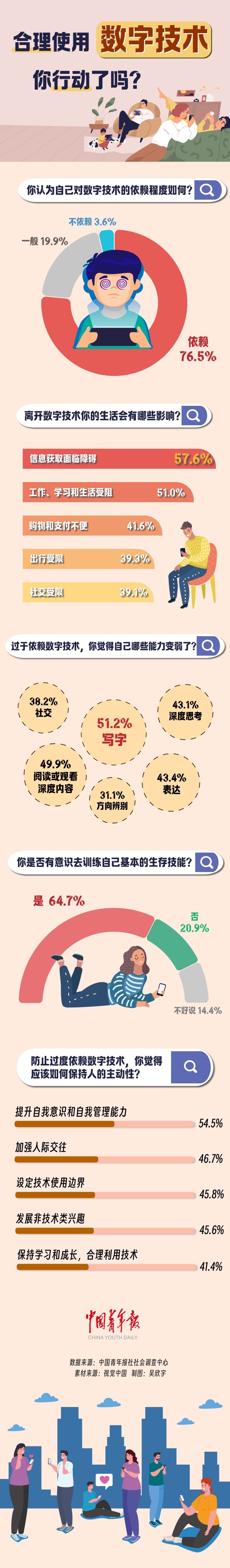 科技进步使得手机应用程序、人工智能工具等成为了我们生活中必不可少的元素。一旦没有了手机导航的帮助,我们很容易迷失方向;若没有了外卖软件的辅助,想要好好吃顿饭也成了一件难事;再加上电子设备和互联网的广泛普及,现在很多人经常会出现提笔忘字的情况……本周,中国青年报社社会调查中心联合问卷网(wenjuan.com),对1342名青年进行的一项调查显示,76.5%的受访青年对数字技术感到依赖,当无法使用数字技术时,57.6%的受访青年觉得信息获取会受到影响。在数字时代更好地工作生活,64.7%的受访青年会有意识地锻炼自己的基本生存技能,54.5%的受访青年认为应当提升自我意识和自我管理能力。
