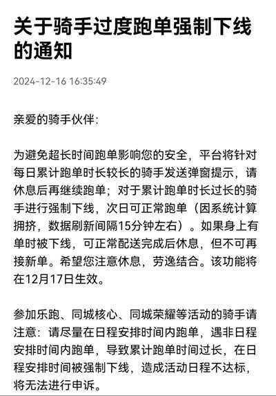 通知还显示,强制下线后,骑手次日可正常跑单。如果是订单派送过程中被下线,可以正常完成配送后再休息,但不可再接新单。