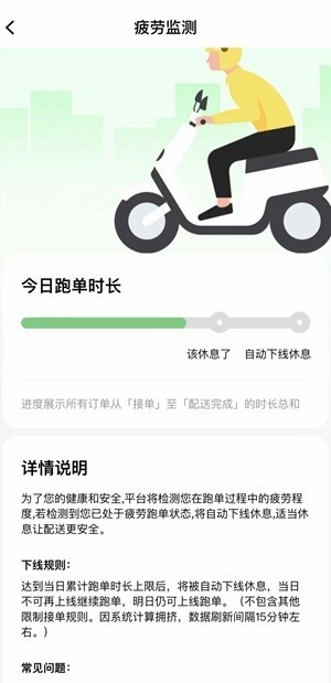 骑手秦师傅说:“这两天就有提示了。因为我跑的时间不是特别长,它会给一个提示,问你是不是感觉身体疲惫。我的室友他(跑单时长比较长)从早上七点到晚上,强制下线,他就回来了。”