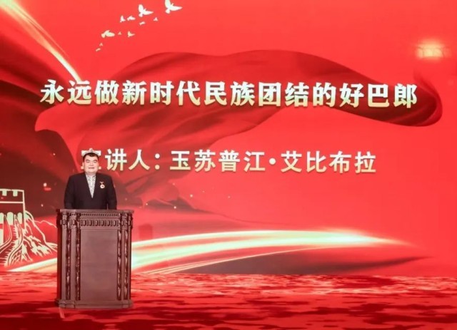 ▲12月27日下午,玉苏普江·艾比布拉在全国民族团结进步模范事迹报告会上汇报。(图片来源:中国民族报“道中华”平台)
