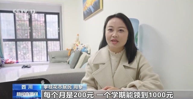 攀枝花市居民 周黎:每个月是200元,一学期能领到1000元。之前我们都是老人在家帮忙照顾孩子,有了这个政策,我们决定将孩子送托,在一定程度上缓解了我们的养育焦虑。