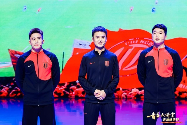 ▲成都蓉城足球俱乐部中方助理教练、前队长甘锐(中),成都蓉城边卫甘超(左),成都蓉城门将蹇韬(右)共同带来现场分享
