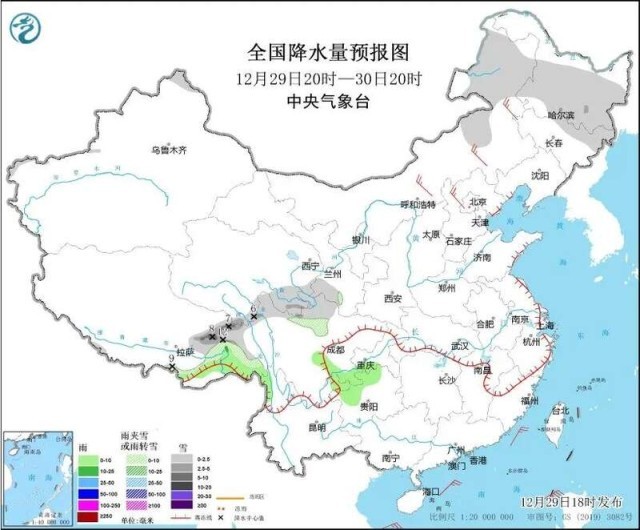 西藏东部和南部、青海东南部、川西高原北部、内蒙古东部、黑龙江、吉林北部等地部分地区有小到中雪或雨夹雪,其中,西藏东北部等地局地有大到暴雪。西藏东南部、四川盆地南部、贵州西北部、云南北部等地部分地区有小雨,局地有中雨。
