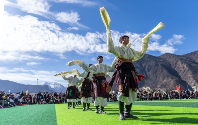在马利镇“云中球场”,当地群众在球赛开幕式上表演舞蹈(1月2日摄)。新华社记者 丁增尼达 摄