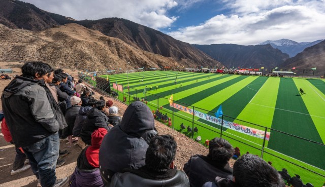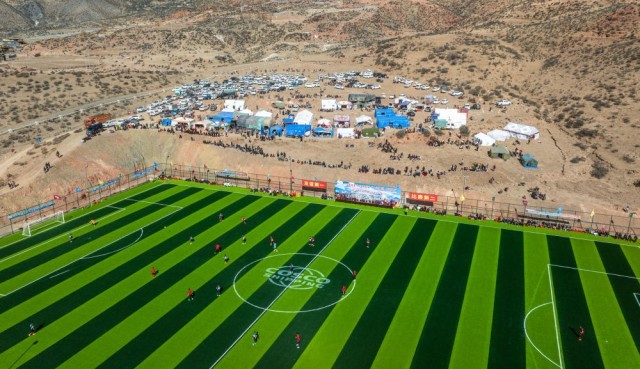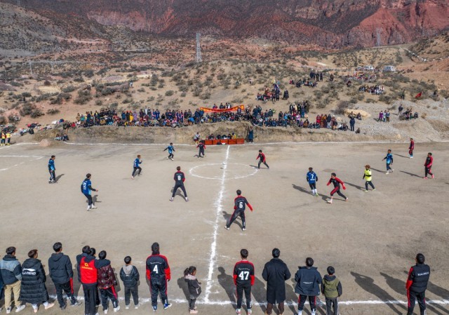 在马利镇“云中球场”,几名球迷趁着球赛间隙踢球玩耍(1月2日摄)。新华社记者 丁增尼达 摄