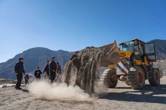 在马利村的足球场上,球员嘎玛加永灯培的爸爸用装载机平整地面(2024年1月20日摄)。新华社记者 丁增尼达 摄