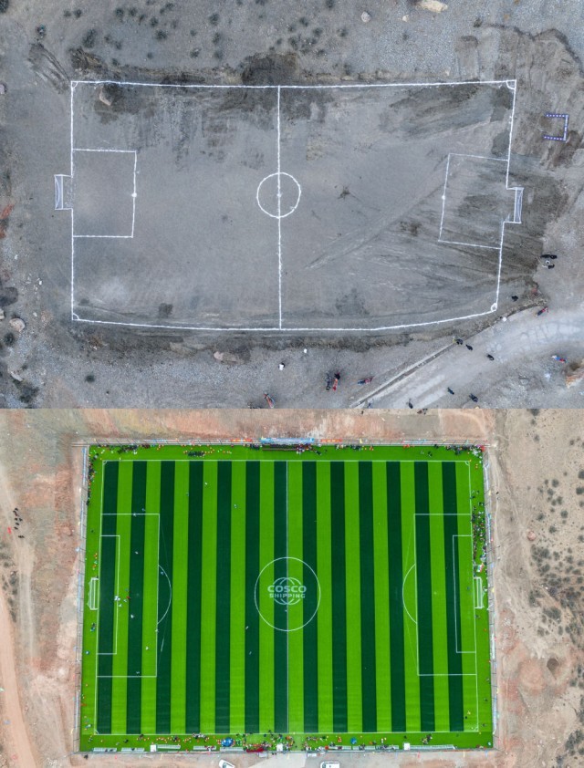 拼版照片:上图为马利村平整后的足球场,曾经马利镇多项赛事都是在这片简易球场上进行(2024年1月20日摄,无人机照片);这是2024年12月竣工的马利镇11人制标准化足球场“云中球场”(2025年1月3日摄,无人机照片)。新华社记者 丁增尼达 摄