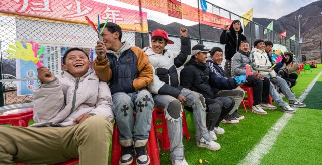 在马利镇“云中球场”,小球迷们在加油助威(1月2日摄)。新华社记者 丁增尼达 摄