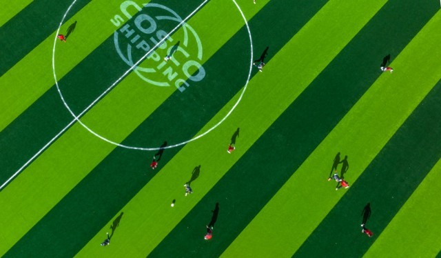 在马利村的足球场上,球员们在拼抢(2024年1月21日摄,无人机照片)。新华社记者 孙非 摄