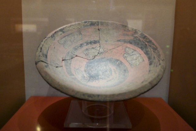这是在陶寺遗址博物馆展出的蟠龙纹陶盘(2024年11月12日摄)。