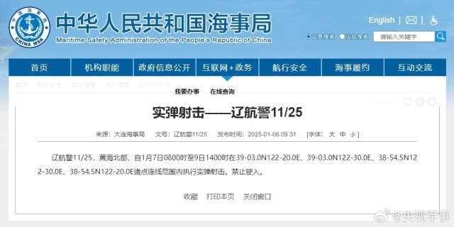1月7日8时至9日14时,黄海北部部分海域执行实弹射击,禁止驶入。