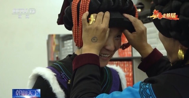 这位大姐给伍加木戴上了自己亲手绣的头饰。此时,记者才意识到,她其实也只是个28岁的姑娘,正是爱美的年纪。