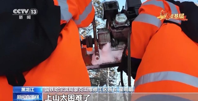国铁哈尔滨局蒙克山维修工区班长 翟明朗:要下山还行,上山太困难了,山里有沟的地方我们看不到,雪都是平的,而有的时候一踩秃噜就掉雪沟里了。