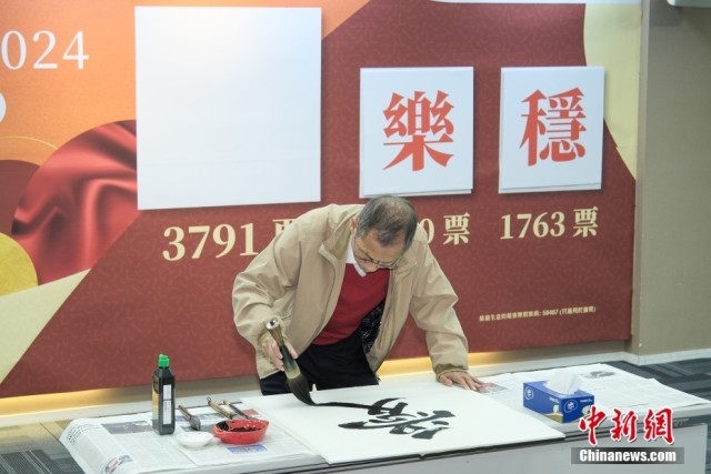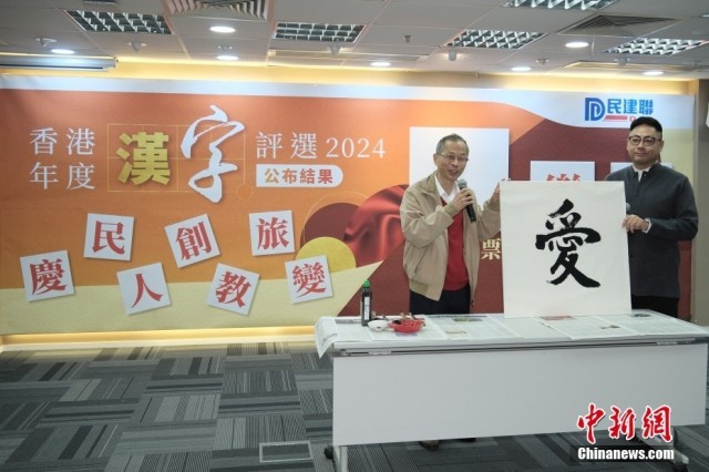 1月15日,香港民主建港协进联盟(香港民建联)公布“香港年度汉字评选2024”评选结果,在“人”“爱”“稳”“变”“教”“庆”“旅”“乐”“创”“民”十个候选汉字中,“爱”字以3791票当选年度汉字。图为香港民建联创党主席曾钰成(左)、香港民建联秘书长叶傲冬公布香港年度汉字“爱”。