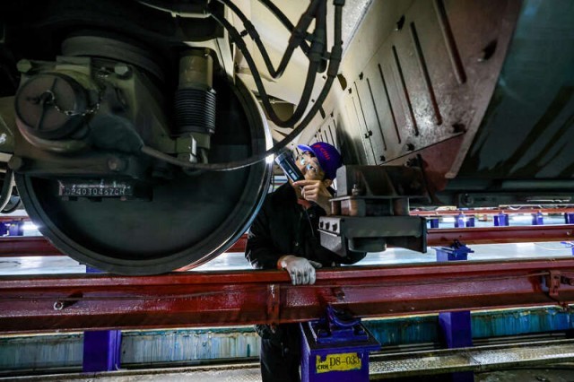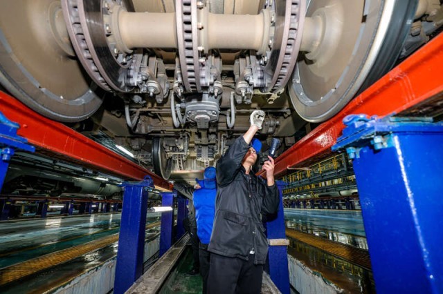 2025年1月15日,北京动车段北京南动车运用所,工人在检修坑道内仔细检查高铁车底转向架等设备。中青在线见习记者 陈思阳/摄