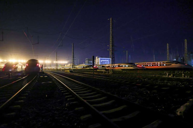 2025年1月16日凌晨,北京动车段北京南动车运用所,一列列高铁动车停靠在四场停车线,宛如钢铁巨龙蓄势待发。中青在线见习记者 陈思阳/摄