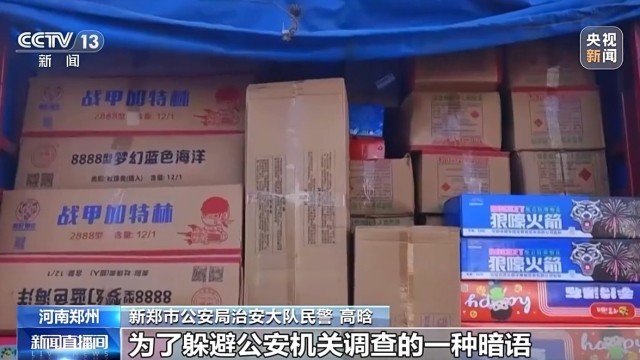 新郑市公安局治安大队民警 高晗:发现车厢内已经装满了烟花爆竹,经清点,烟花爆竹共计200余箱,该司机在未获得烟花爆竹道路运输许可情况下,非法运输烟花爆竹。