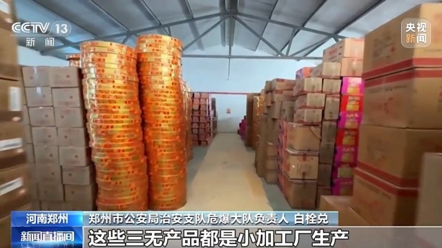 郑州市公安局治安支队危爆大队负责人 白栓兑:这些“三无”产品都是小加工厂生产,添加了一些高氯酸钾、高氯酸盐等高敏感度的化学物质,也是商家刻意追求烟花爆竹的声响或者脆度,违规添加不应该添加的这些成分。