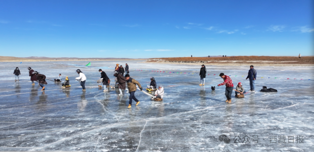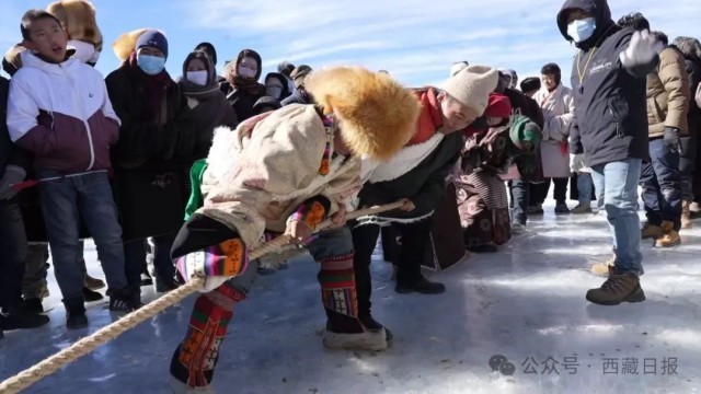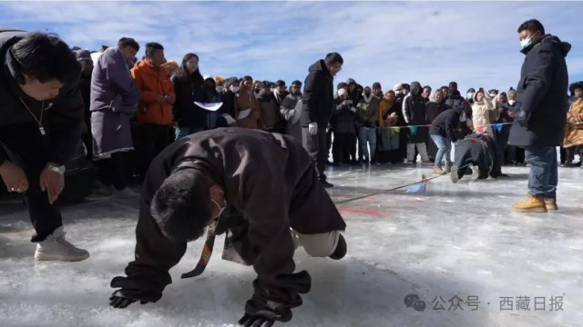 赛场上,传统冰上项目亮点纷呈。牛嘎滑冰车(个人)赛中,选手身轻如燕,技巧娴熟,在冰面上风驰电掣;木制滑冰车(个人)和亲子赛同样扣人心弦,无论是个人赛的奋勇争先,还是亲子赛的默契配合,都让观众们目不暇接。自由滑冰赛里,大家展现着冰雪运动的自由与奔放。团队项目更是将气氛推向顶点。冰上拔河,大家脚蹬冰面、咬紧牙关、全力拉扯,每一寸绳子的移动都牵动着众人的心。冰上接力赛中,选手交接棒时的默契配合、全力冲刺,传递着团结与拼搏的力量。呐喊声、欢呼声交织在一起,在夯错湖畔久久回荡。